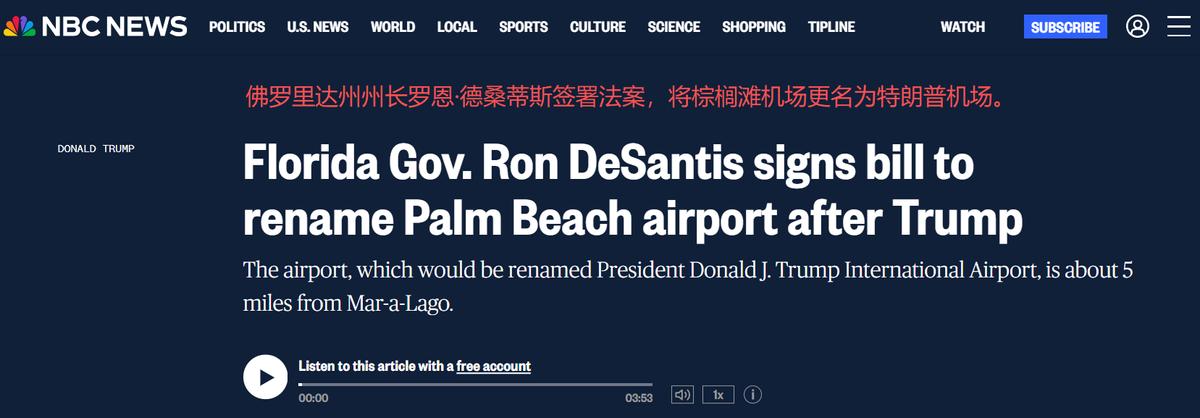 近日,美国佛罗里达州共和党籍州长德桑蒂斯正式签署一项法案,决定将该州的棕榈滩国际机场更名为“唐纳德·J·特朗普总统国际机场”。下一步,该法案将送由美国联邦航空管理局批准,如果最终获得通过,棕榈滩国际机场的更名将于今年7月1日正式生效。