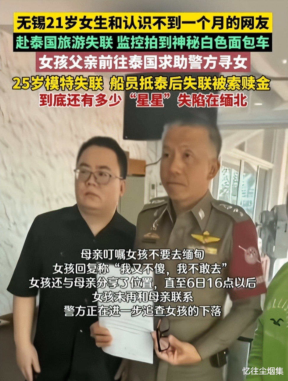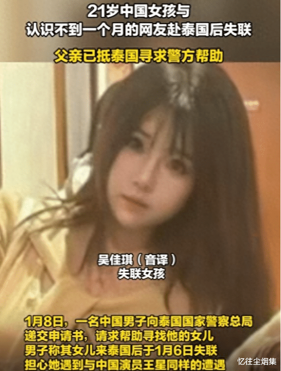 这两天,一个让人揪心的消息在泰国传开了-一名中国姑娘Wujiaqi,才21岁,从1月6号开始人就不知道跑哪去了。这事闹得挺大,她爸都火急火燎地赶到泰国,直接杀到警察总署找署长吉迪拉警上将帮忙。搞得大家都有点心惊肉跳的是,这事跟前阵子王星那档子事儿太像了。这不,Wujiaqi她爸二话不说,一落地就直奔素万那普机场警察局,把事儿给报了。这事儿说起来怪邪门的,一个大学刚毕业的姑娘,头一回出国就玩失踪这一出。警方这边也是立马重视起来,毕竟这阵子泰国这边类似的事故也不少见。这趟泰国行,压根儿就没跟家里打招呼。