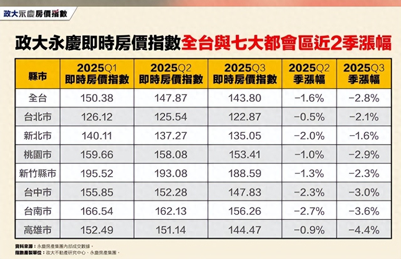 2025 年第三季 “政大永庆即时房价指数” 于 10 月 8 日正式公布,数据显示,全台及七大都会区房价指数全面下跌,且跌势较上季明显扩大。其中,全台房价指数季跌幅达 2.8%,高雄以 4.4% 的季跌幅成为七大都会区中跌幅最显著的城市,台南、台中紧随其后,季跌幅均超 3%,房市整体仍处降温通道。