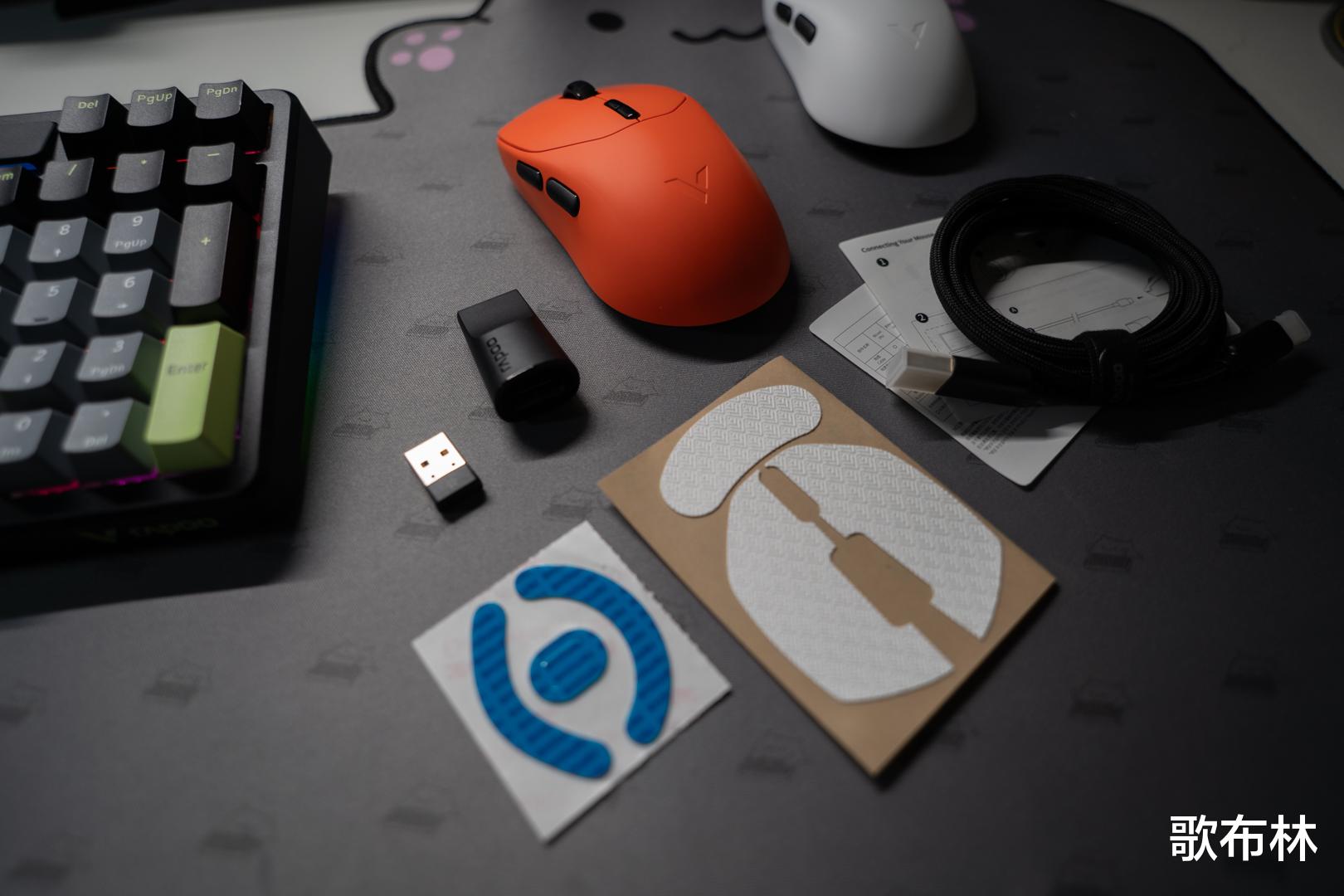 在配件方面,雷柏一如既往地提供了完备的附件,旨在提升用户的开箱体验与产品使用寿命。附件中包含防滑贴(增强握感并保护鼠标本体)、备用替换脚贴(应对长时间使用后的磨损)、USB接收器延长器(有效避免无线信号干扰)以及产品说明书。