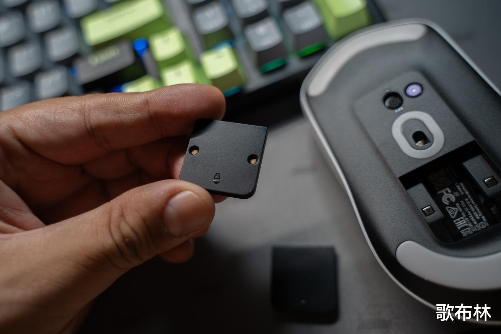 将鼠标翻转过来,可以看到最核心的传感器居于中心位置,让你无论抓握哪个部位,光标都能精准跟随。上中下三块细长脚贴的布局似乎是近期高端鼠标行列里比较流行的配置方案,它就像为鼠标装上了滑轨,快速甩动时也能保持顺滑平稳。特别实用的是,传感器上方设有一个功能按键,下方则隐藏着2.4G接收器的“家”,再也不用担心小巧的接收器会丢失。最惊喜的是,底部还支持更换无线充电模块,让鼠标真正实现“放下去就充电”的无感体验。