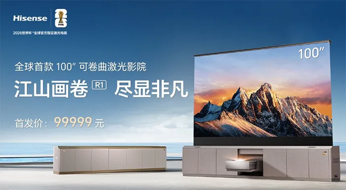 另一款为全球首款100英寸可卷曲激光影院——江山画卷R1,以99999元的定价开启预售,全球限量1000台。产品采用行业首创的“凌云卷幕系统”,通过超薄柔性菲涅尔膜片与碳纤维龙骨支撑结构,实现万次卷曲后屏幕平整度大于99%,打破百英寸硬屏卷曲平整度世界纪录。