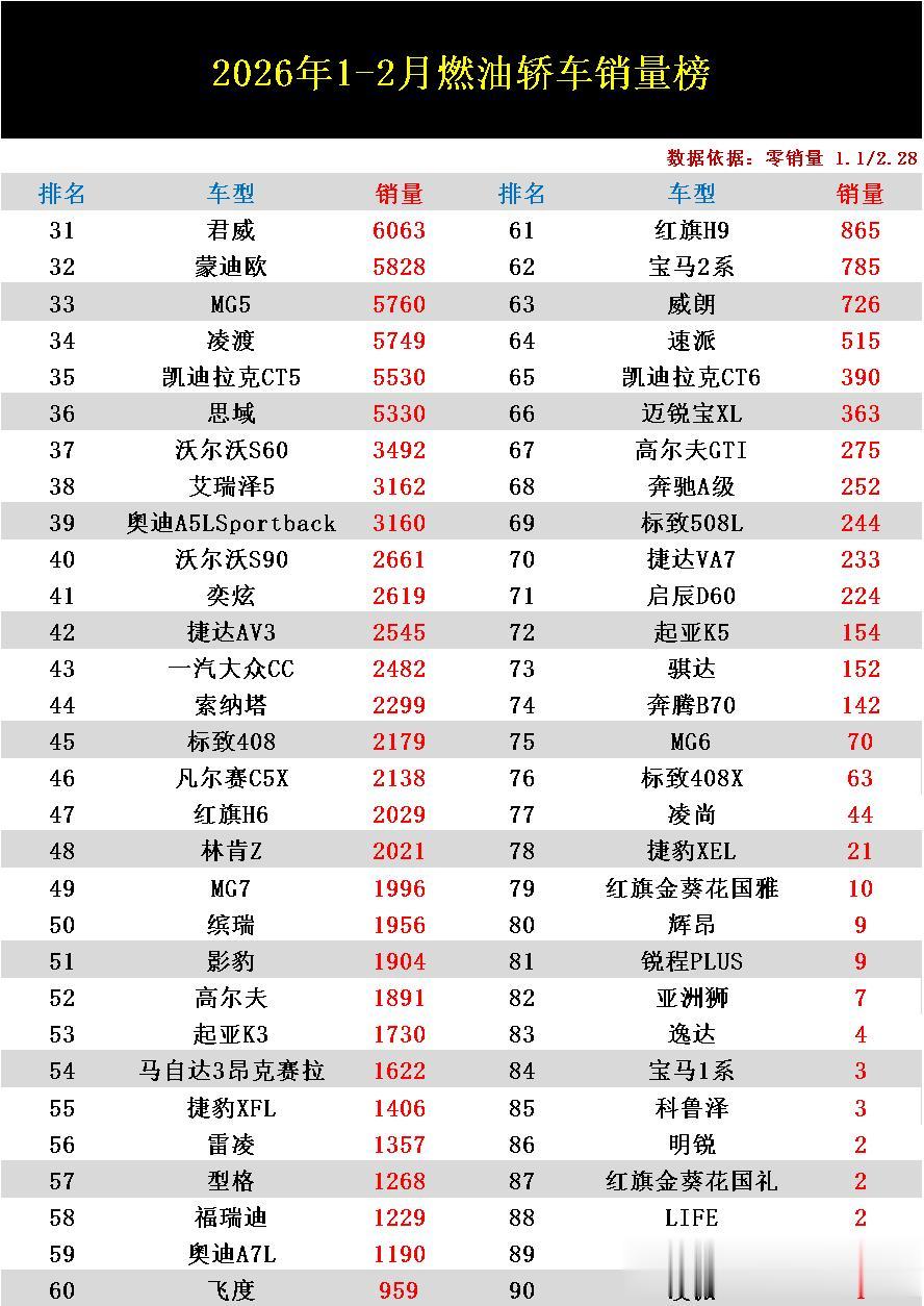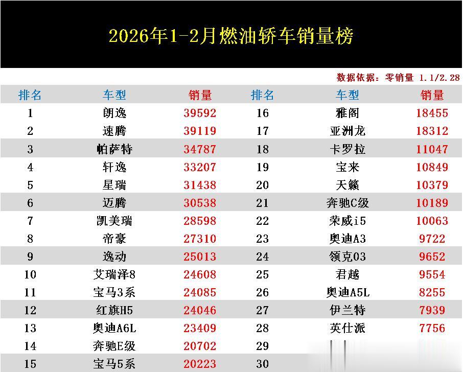 导读:刚翻看完2026年1-2月燃油轿车零售量排行榜,给人的第一印象就是合资品牌的市场竞争力就是强大。在榜单头部阵营中除了少数几款国产车型能够与之抗衡以外,大部分名额依旧被合资品牌车型收入囊中。从榜单数据来看,合资品牌的大众系列在燃油轿车市场最为受欢迎,比如朗逸、速腾、帕萨特这三款车型都稳居榜单前三甲,迈腾也都跻身榜单第六。而日系品牌方面也都深受消费者青睐,日产轩逸累计销量突破3万辆,凯美瑞名列榜单第7,雅阁亚洲龙、卡罗拉、天籁等主力军也都持续贡献出了万辆以上的佳绩。不过、最让人意外的是自主品牌车型在榜单中的表现,其中吉利星瑞、帝豪、逸动以及艾瑞泽8等4款车型均逆袭至榜单前十名以内。又洗牌了!1-2月燃油轿车销量榜:德系大胜,轩逸第5,卡罗拉第16