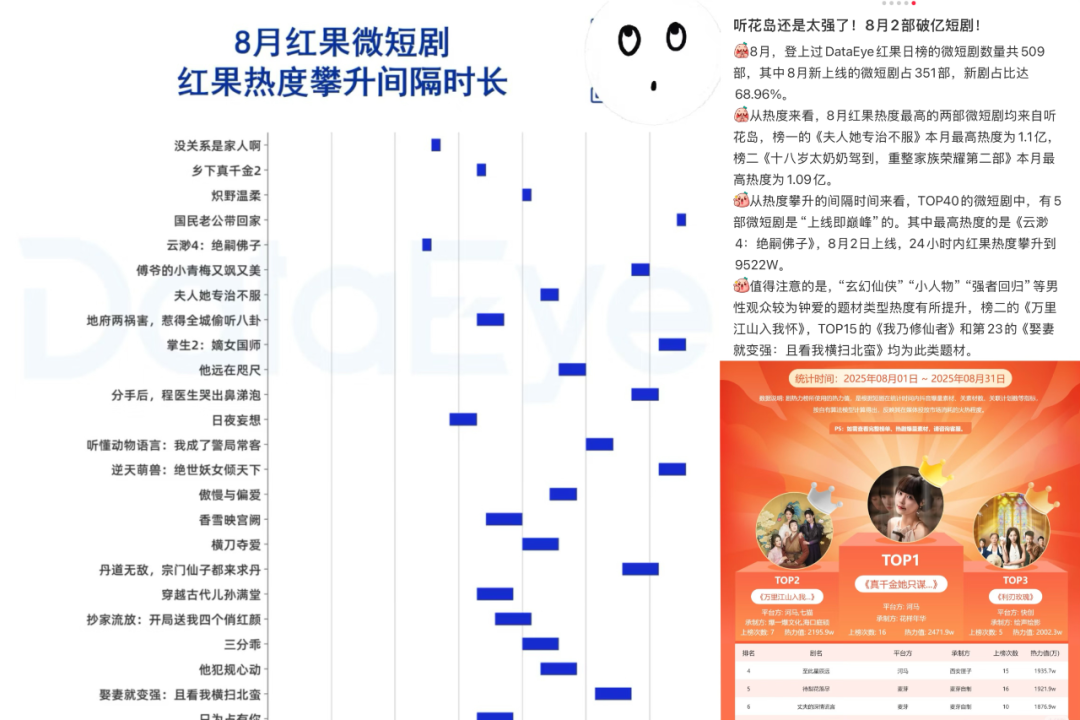 上述现象,其实揭示了听花岛在短剧市场中的独特运营策略——以流量为导向,通过精准的资源配置和强大的投流能力,快速打造爆款,进而巩固和扩大其市场影响力。