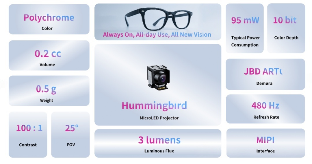 ⏩ 全球最小彩色光引擎:0.1英寸Micro-LED微显示屏,搭配X-Cube架构,体积仅0.2立方厘米(约黄豆大小),重量0.5克,却能输出全彩画面。这一成果直接攻克了AR眼镜“体积与画质”的矛盾,为轻量化设计铺平道路。