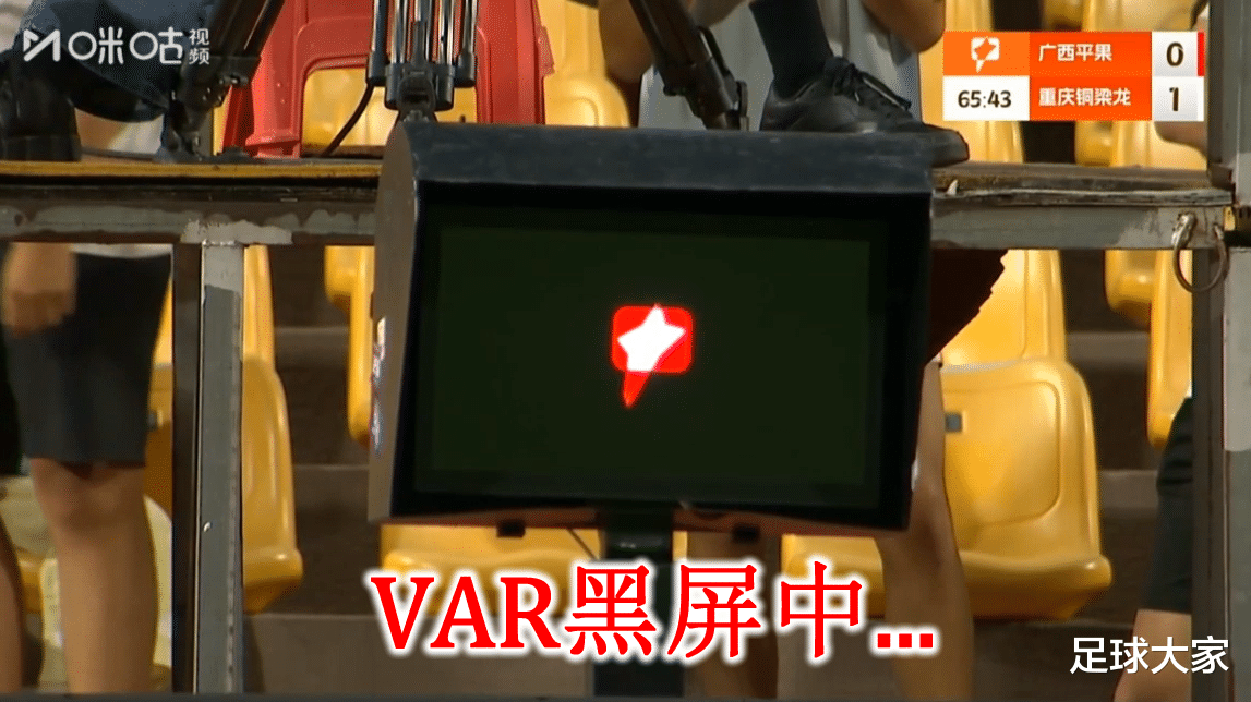 首先是主裁判的耳麦坏了无法跟VAR视频助理裁判沟通,只好去场边拿对讲机。沟通了一会,结果发现VAR视频仪器黑屏(下图),主裁判无法现场观看犯规动作重放。最后只好无奈地放弃,维持原判没有点球。重庆铜梁龙逃过一劫,当然这个只能怪主队主场的VAR不给力。