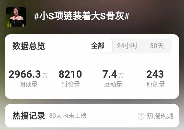 具俊晔作为小S的姐夫,对待大S也是念念不忘。正所谓,亲情的力量超越古往今来!这就是台湾观众为什么喜欢大S和小S的原因!因此,网友们纷纷关注小S项链装着大S骨灰消息!这一话题阅读量超过2966万,互动量7.4万,讨论量8210。在这个夏去秋来的人间好时节,小S金钟奖造型,给观众带来温暖与感动。