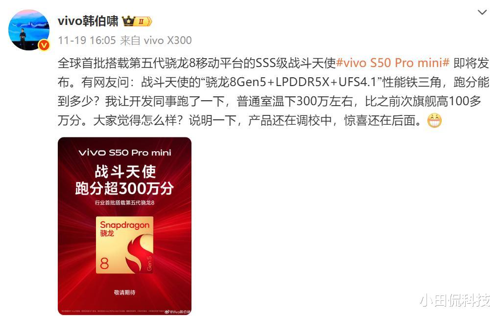 早前,vivo高管就爆料了vivo S50 Pro mini具备超强战斗力,甚至有一个内部代号叫“战斗天使”,高颜值自不必说,实力方面搭载首批搭载高通骁龙8Gen5,跑分超300万,在中端机里战斗力堪称逆天!而且这次的vivo新机将全系搭载LPDDR5X和UFS4.1,还有索尼IMX882大底潜望长焦、3D超声波指纹2.0等等,势要将手机体验感方方面面都做到位。