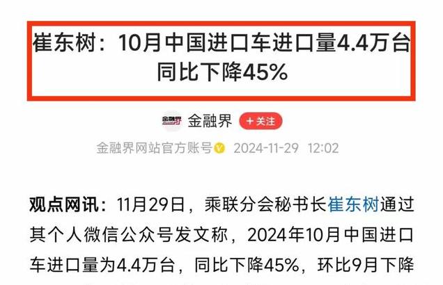 11月29日,根据乘联会秘书长崔东树透露,2024年11月,我国进口汽车4.4万台,同比下降45%,环比9月下降21%,创下近期罕见的巨大跌幅。