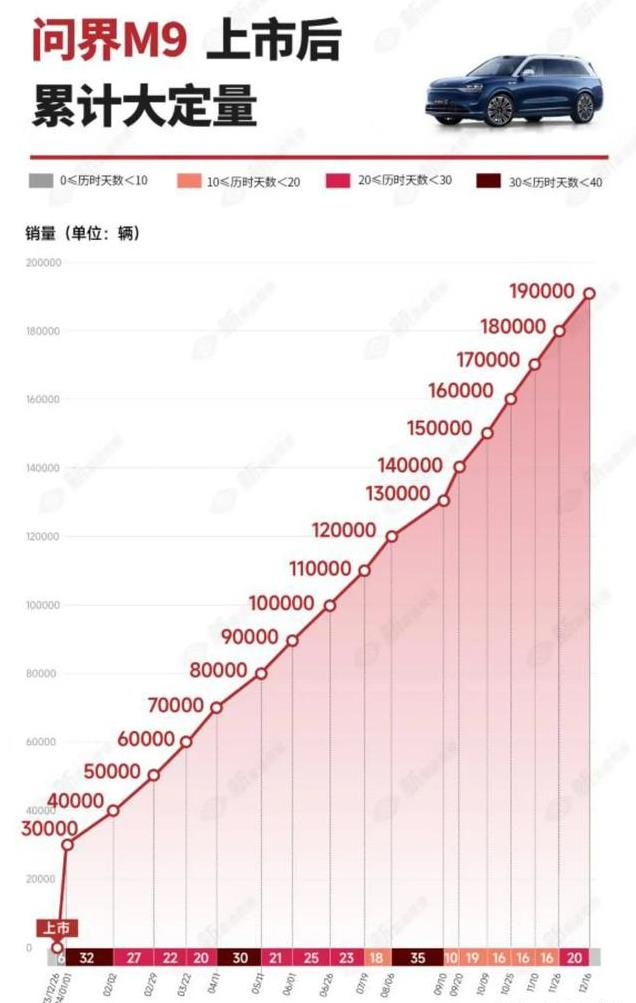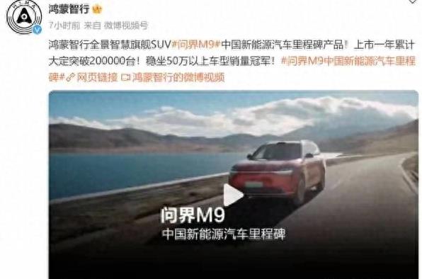 12月25日晚11点半左右,鸿蒙智行官宣:“问界M9上市一年,累计大定突破200000台,稳坐50万以上车型销量冠军”。
