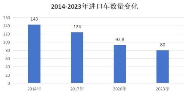 2014年,我国进口车销量的最高峰,进口量为143万量,此后以8%的速度下降,2017年进口汽车只有124万台,到2020年,只有92.8万台,到2023年,下降到80万台。