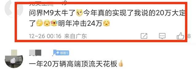 3、一位广东网友表示:“问界M9太牛了,今年真的实现了我说的20万大定,明年冲击24万”。