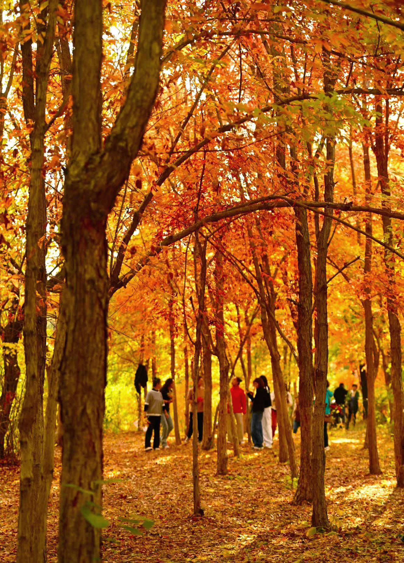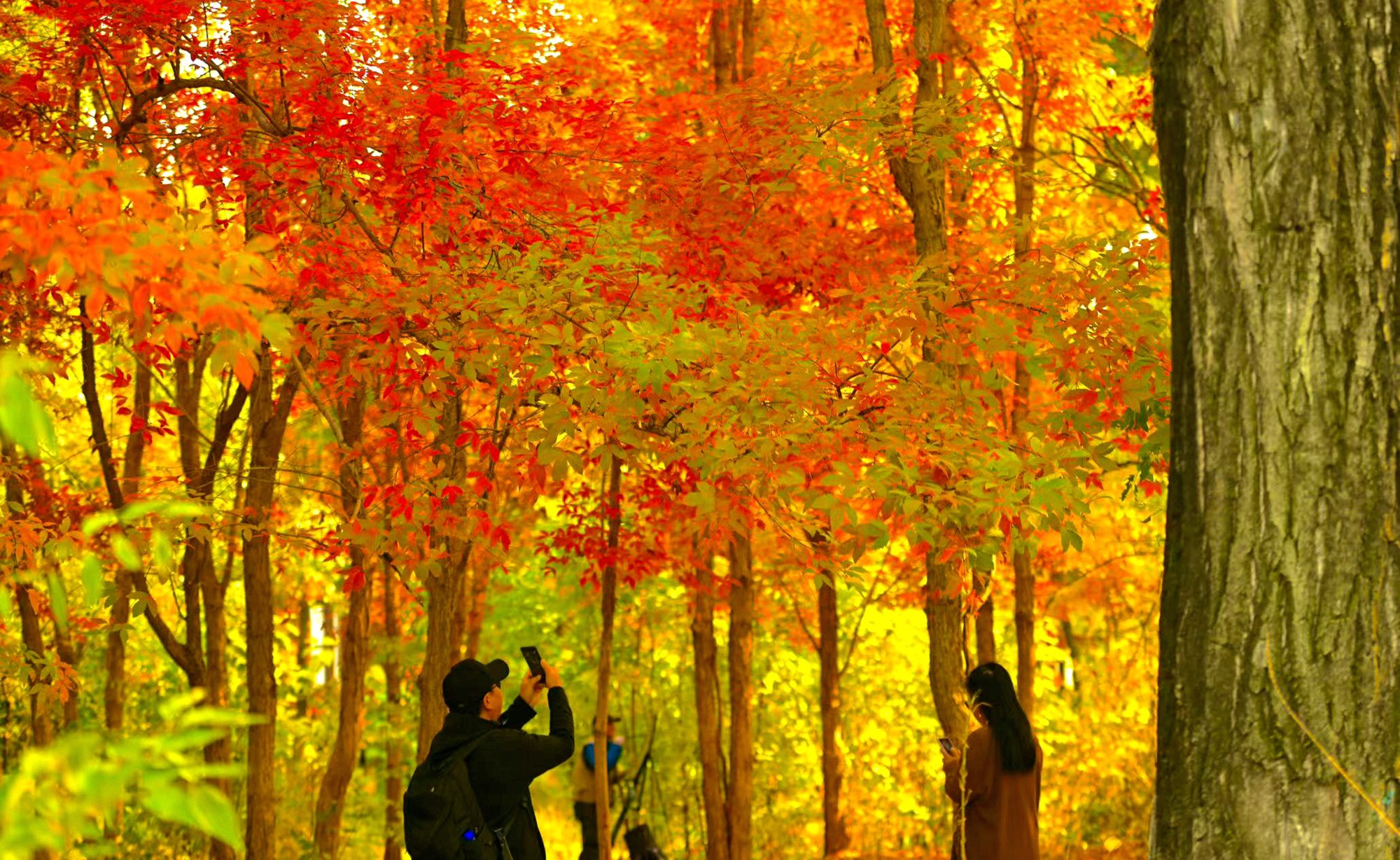 走进南湖公园,季节交替的气息扑面而来,秋天的“主角”已悄然登场。阳光透过半绿半黄的叶片,洒下温和的光影,让人既能捕捉到夏天的余韵,又能触摸到秋天的脉搏。在公园4号和5号门附近的西部林地,近20公顷的红叶林成为秋日里最耀眼的存在。拧筋槭、茶条槭、色木槭、美国红枫等品种竞相“变脸”,有的染上热烈的红,有的透着浓郁的橙。今年新增加的200余丛假色槭更是格外夺目,其颜色比其他枫叶品种更加鲜艳,景观效果持续时间也更长。待霜降过后,这片红叶林将迎来颜值巅峰,层林尽染的画面如同展开一幅绚丽的油画。