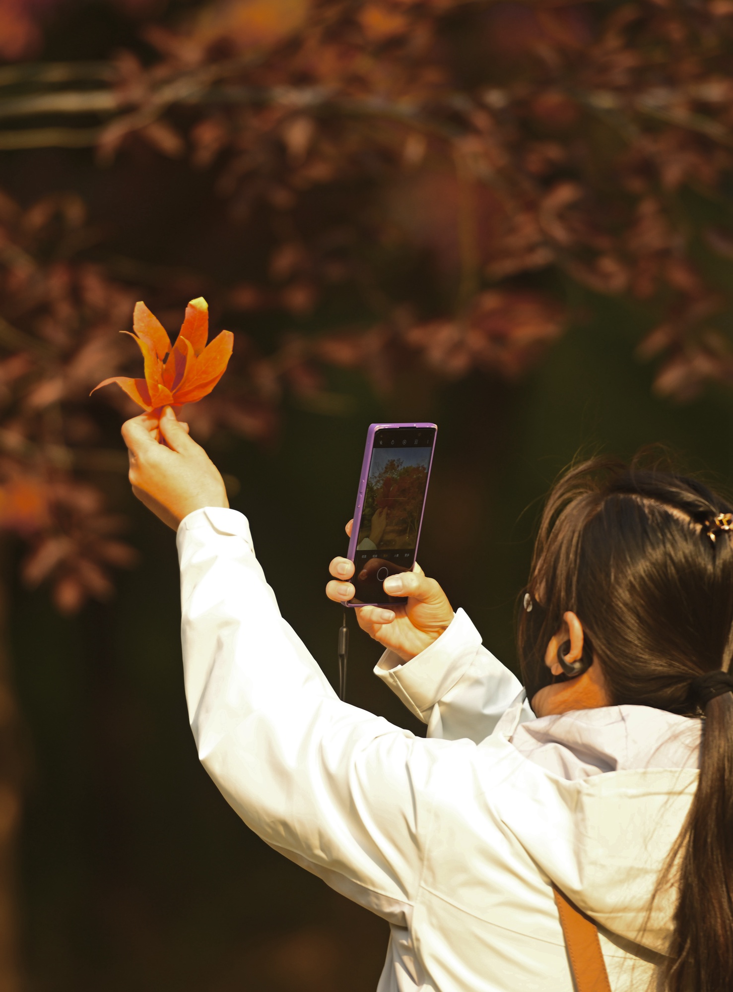 不少市民被这片红叶吸引,纷纷前来拍照打卡。“景色太好了,空气也好,红叶子、绿叶子、黄叶子搭配在一起非常好看。”市民李女士一边举着手机拍照,一边赞叹道。除了拍照的市民,绘画爱好者也带着画板和颜料来到这里,以笔为媒,将眼前层林尽染的秋景细细描绘,让南湖的秋韵在画布上永久留存。
