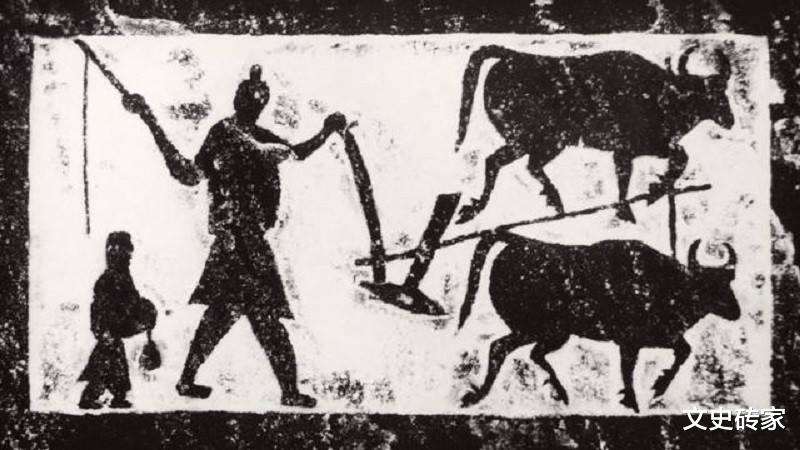 汉朝农民驱使耕牛耕作版画