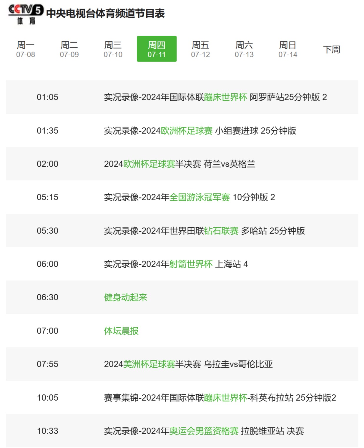 7月11日CCTV5和5+的节目安排已经确定,三个时间段将带来直播节目,其余时间都以录播为主。首先就是凌晨3点的欧洲杯半决赛,以及早上8点开始的美洲杯半决赛,两场足球比赛热度都非常高,相信有大批球迷熬夜加早起,观看英格兰战荷兰,乌拉圭战哥伦比亚的比赛。