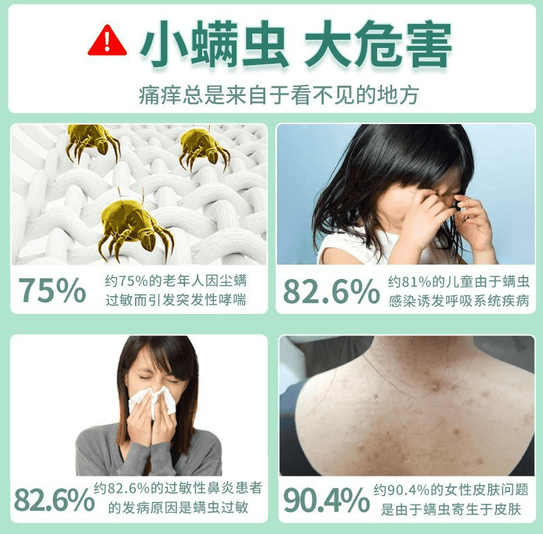 床垫、枕头、被褥等与人体直接接触的物品,因持续产生皮屑(尘螨食物),尘螨易快速滋生,清洁后效果通常维持1周左右。