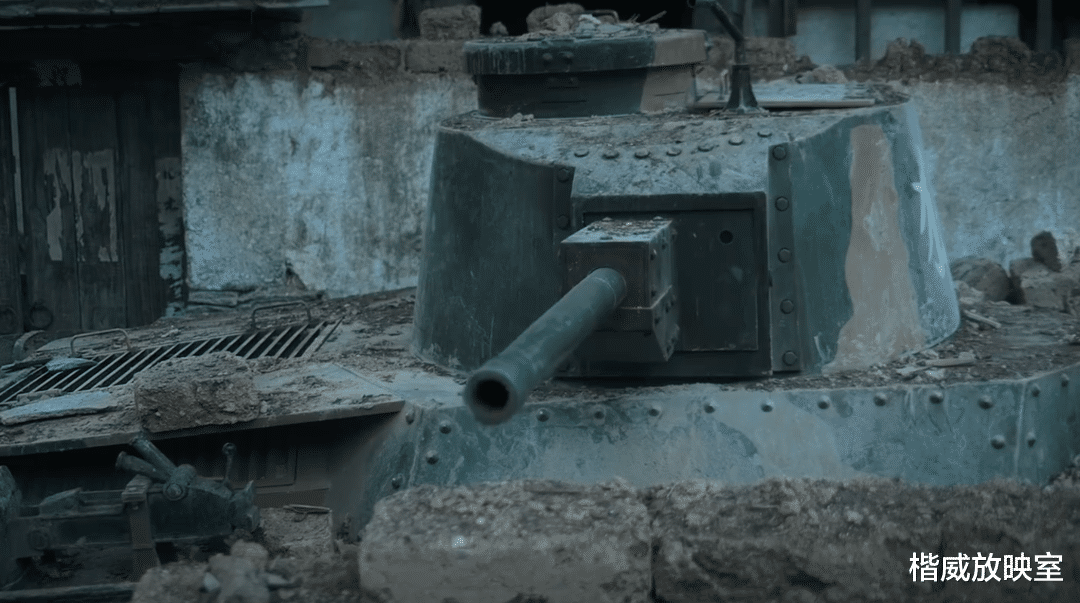 可以看到影片的结构也基本形成,最初江河之上的流民图景,转至宜昌当地落脚后,迎来三个日本人的闯入。故事的紧张与压迫感与此前的某些幽默诙谐形成反差,直到日本军队开着坦克来屠村后,进入到影片最后一个大的事件中。在这个镇上,除了有限的几杆枪和子弹外,唯一可以与其抗衡的就是瑞士制造的苏罗通机关炮,这是影片里的关键道具与抗战武器。