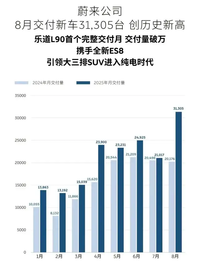 8月,蔚来总交付突破3.13万台,创历史新高,环比增长49%,时隔34个月反超理想,重返新势力头部。其中蔚来品牌10,525辆,乐道16,434辆,萤火虫4,346辆。