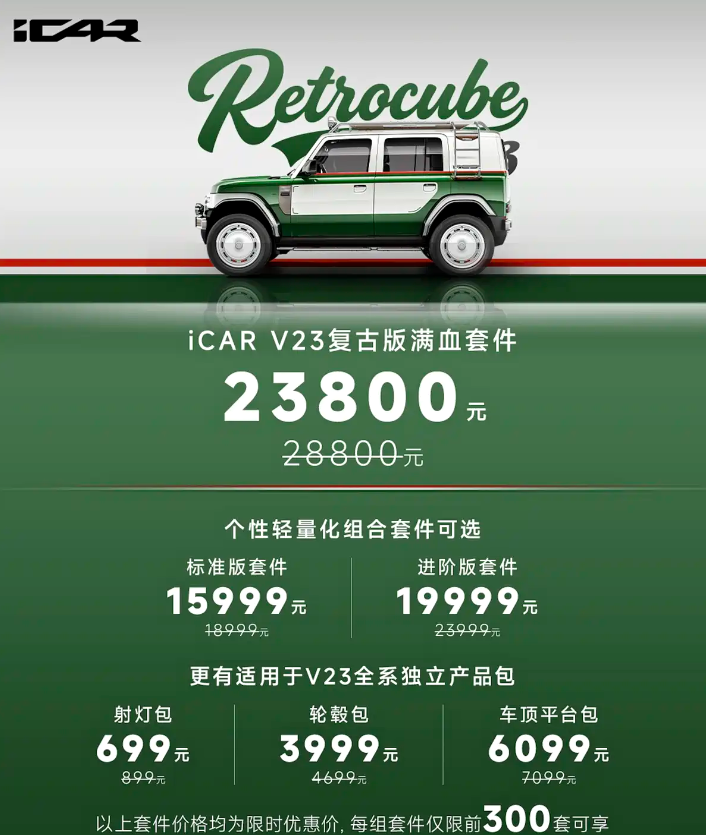 而这也恰巧印证了一个事实,那就是国内消费群体对“求同存异”以及“情绪价值”的态度。不过受限于购车成本,尽管有不少人对坦克300赛博版的颜值很感兴趣,可奈何“溢价”确实高,也就导致这样的产品注定只是少数人的玩具,无法真正铺向市场。或许是为了进一步扩大品牌知名度,超境汽车将合作目标放在了10万级的硬派越野SUV身上,与奇瑞iCAR V23合作推出了一款复古套件,并采用“限时售卖”的营销方案。