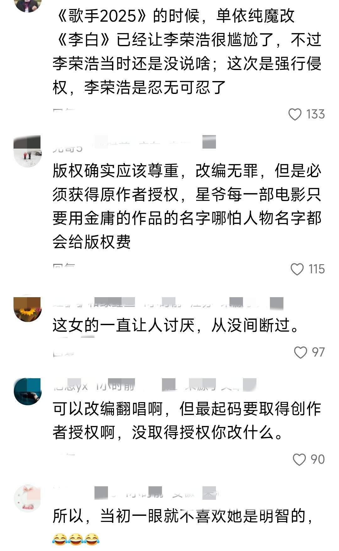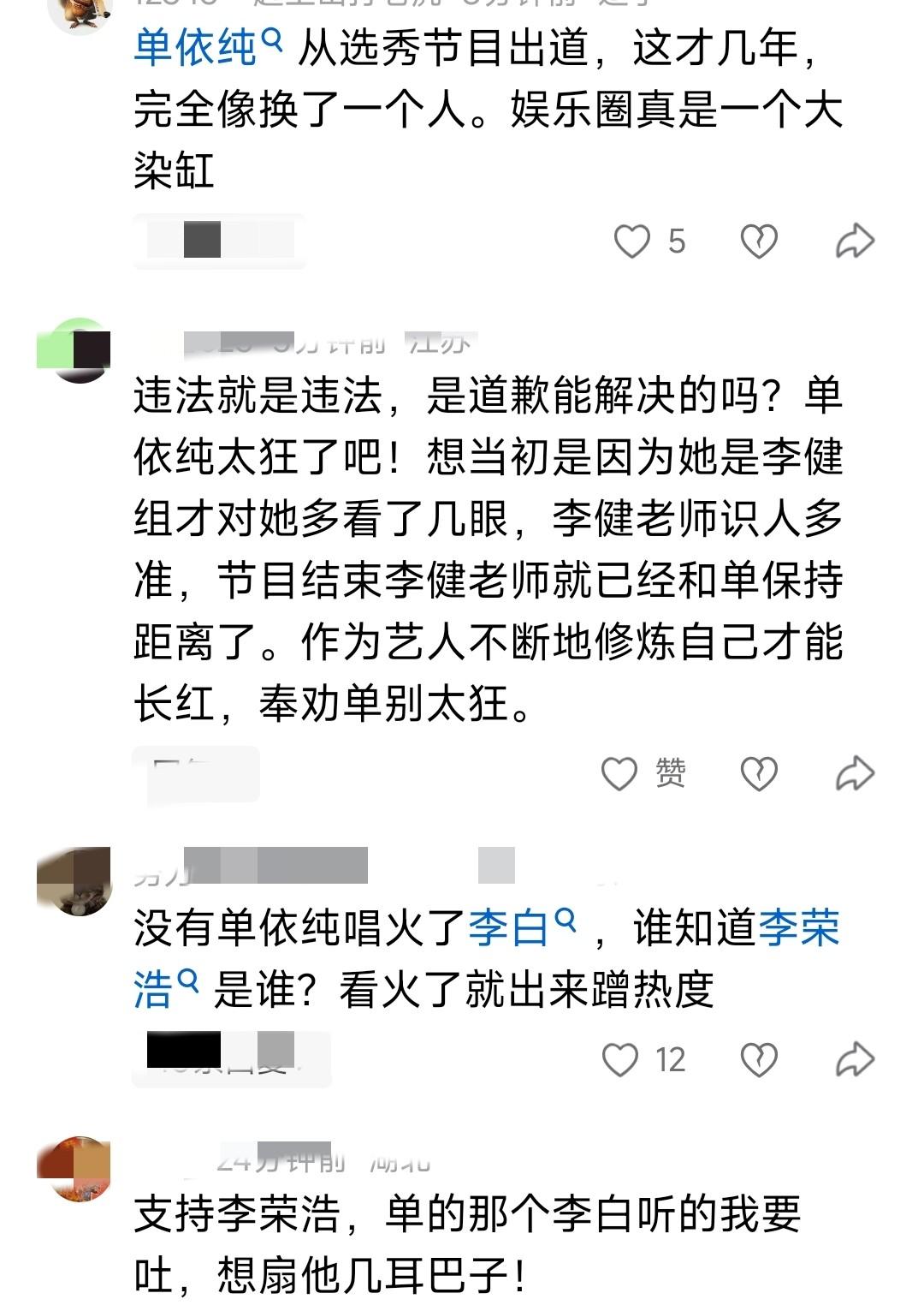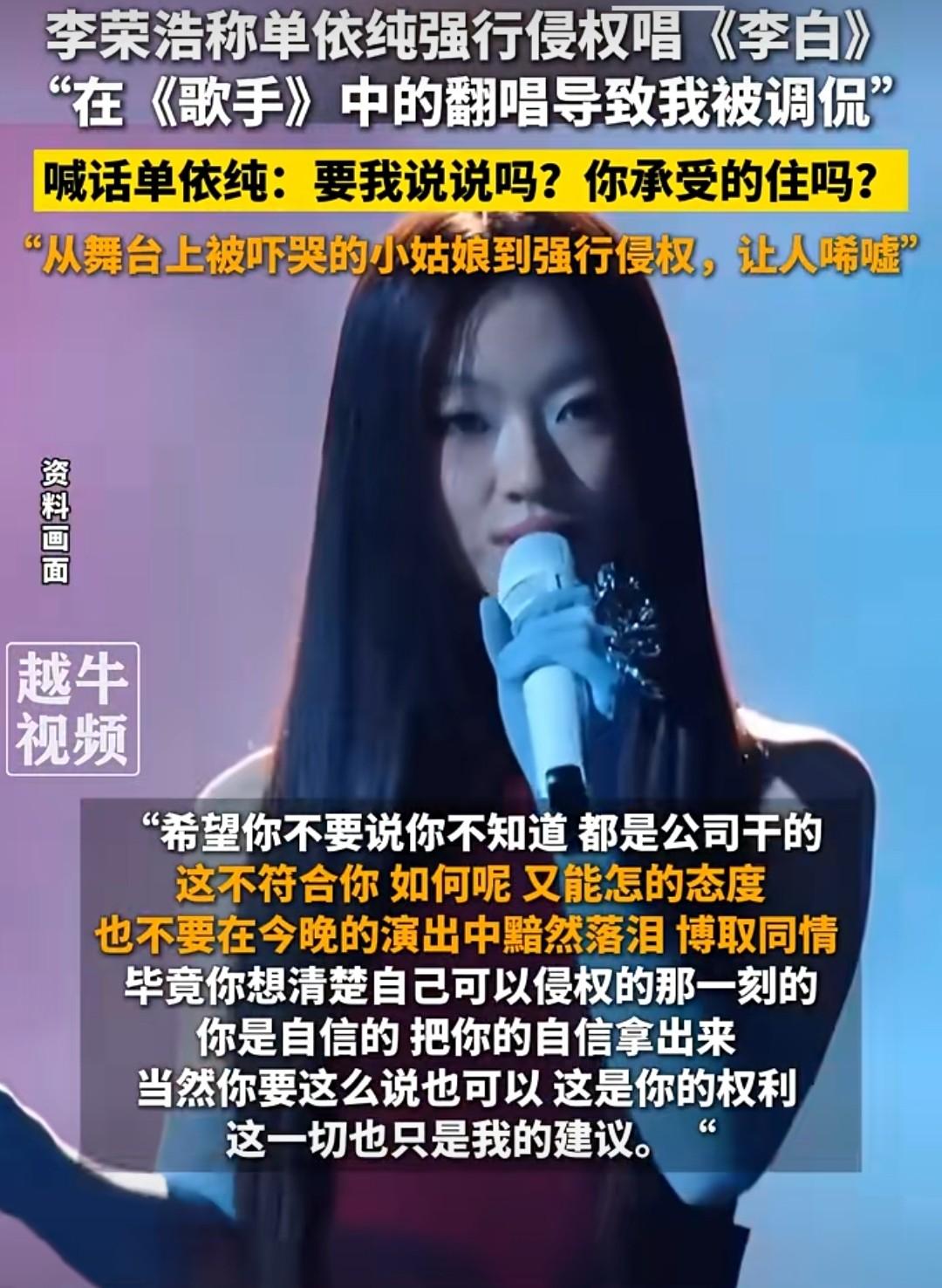 单依纯这个直接改编演唱的《李白》在道歉里说不清楚状况,作为监制,把所有责任推给团队,再一次惹怒了李荣浩,李荣浩坚持不接受道歉,不需要赔偿。