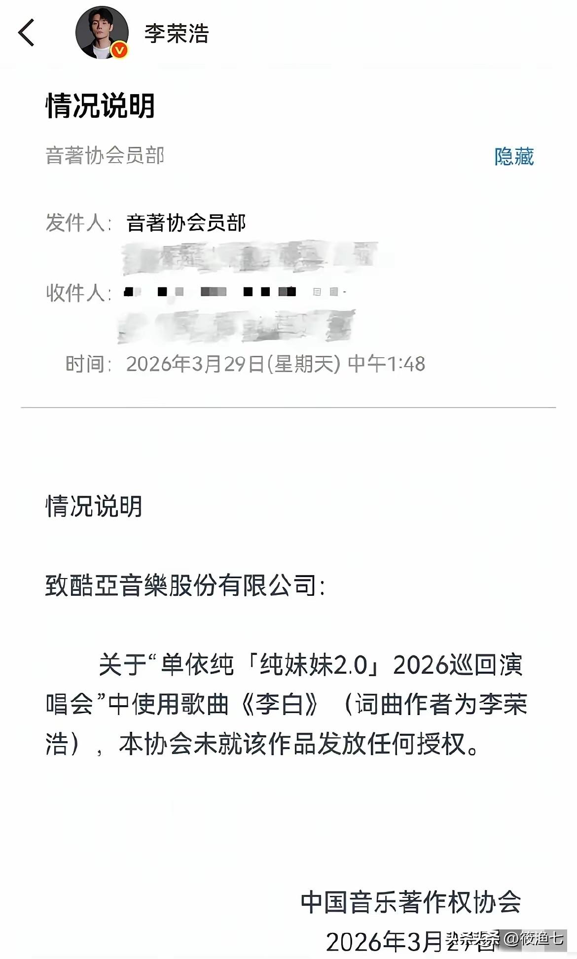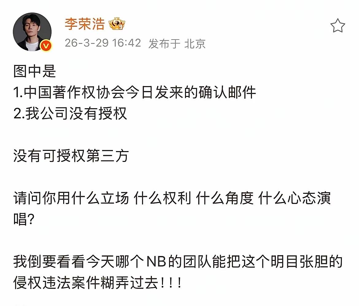 这次李荣浩不再惯着单依纯,在单依纯发布道歉后,再次发文质问单依纯,直接发出四连问“没有我的授权,请问你用什么立场?什么权利?什么角度?什么心态演唱?”,更是晒出了著作协会的确认邮件以明确表示自己公司没有授权。