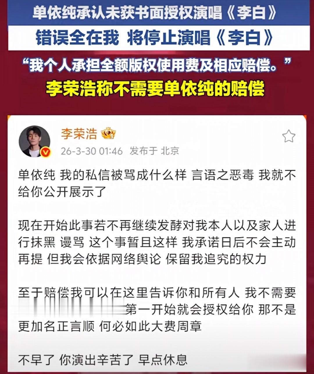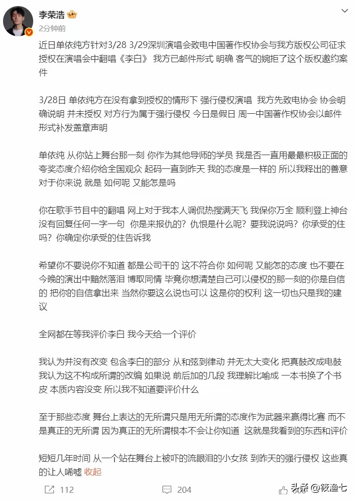 在李荣浩第一次发文公开喊话单依纯,明确婉拒了翻唱授权的情况下,单依纯依然强行侵权演唱《李白》,自述自己对单依纯的善意换来的却是“如何呢,又能怎?”。