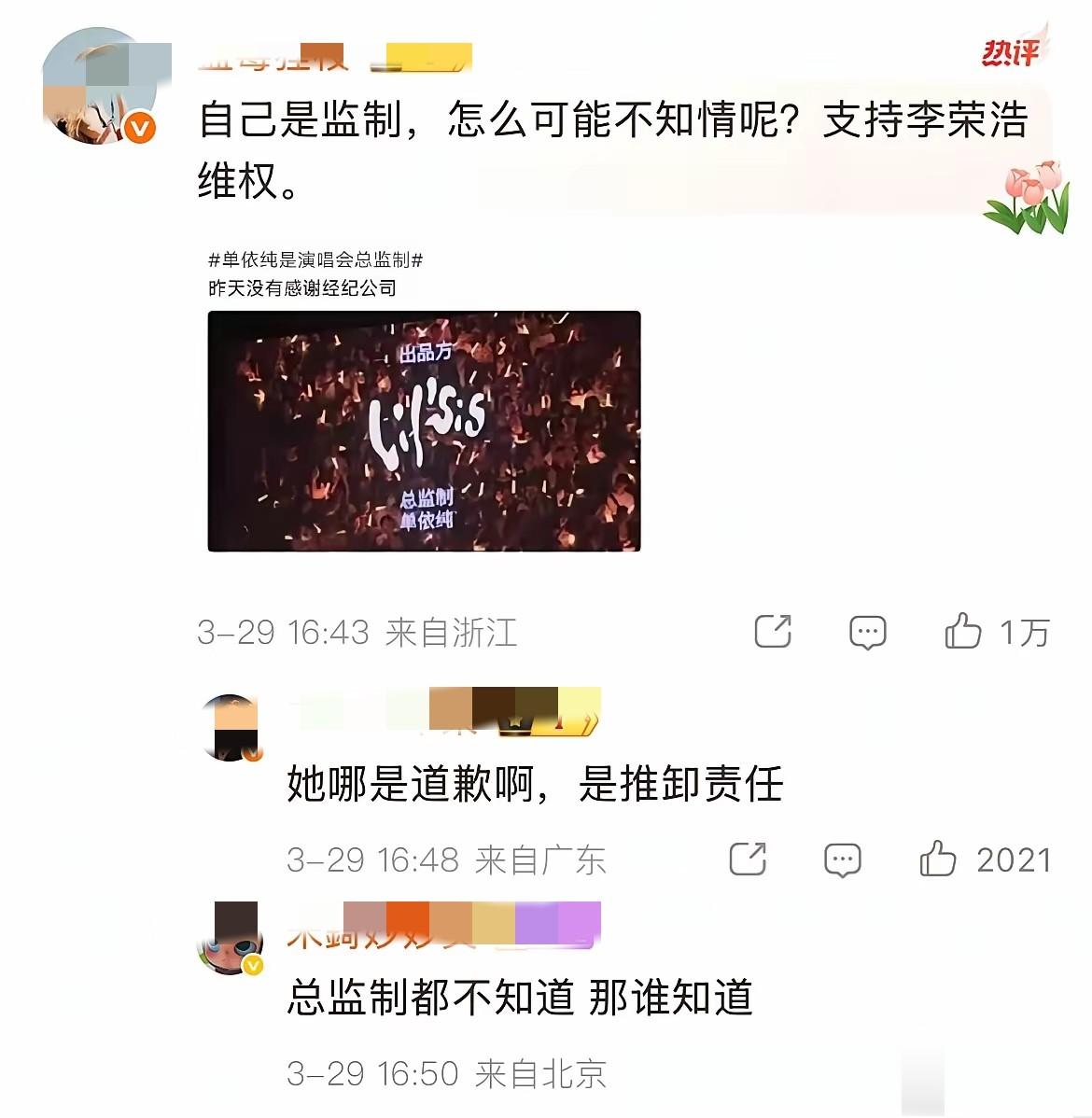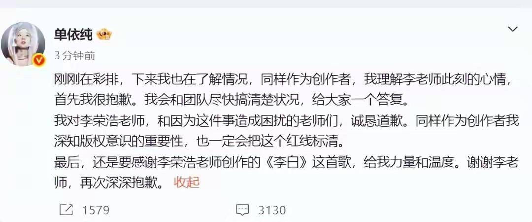 单依纯立即回复了李荣浩,公开道歉,但细品这个道歉经不起推敲,居然表明自己作为监制却说不了解情况,把责任全部推到了团队身上,会尽快搞清楚状况等。