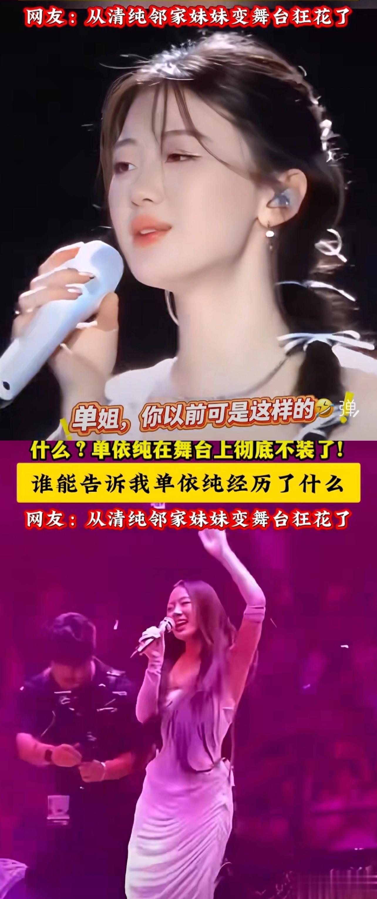 单依纯刚出道以单纯的形象示人,如今早已变得完全不一样了,风格也越来越标新立异,自称创作型歌手,实际唱的歌全部都是改编和翻唱,几乎没有一首原创,这样注定不会走的太长远。