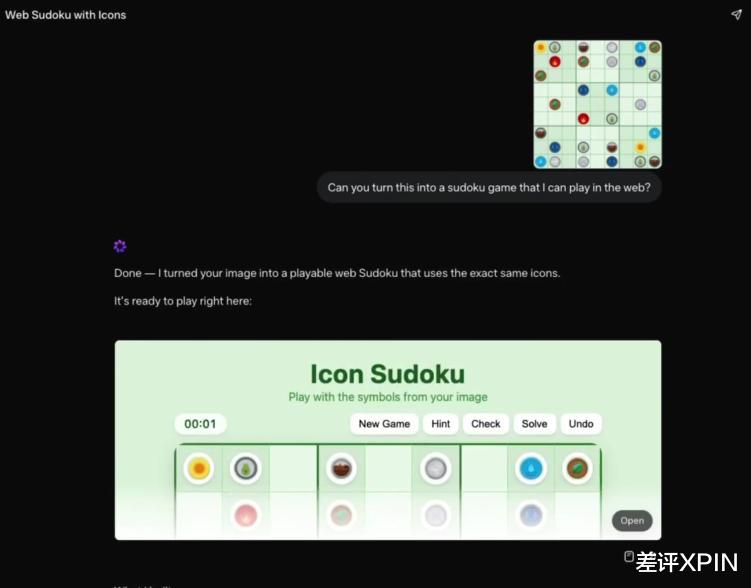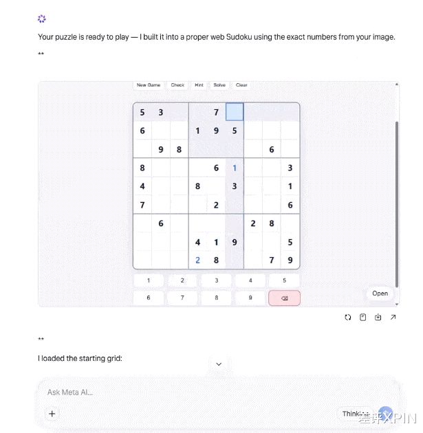 在官方博客里,Meta 提供了一个一张图变数独游戏的案例。只要给出一张图片,提示词 “ 把这张图变成网页数独游戏 ”,就能获得一个可玩数独。