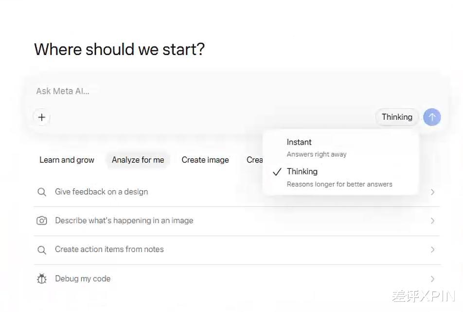 目前 Muse Spark 只开放了 Instant 和 Thinking 两种模式,前者快速回答,后者有一些思考和推理能力,我们这回主要测能力更强的 Thinking。