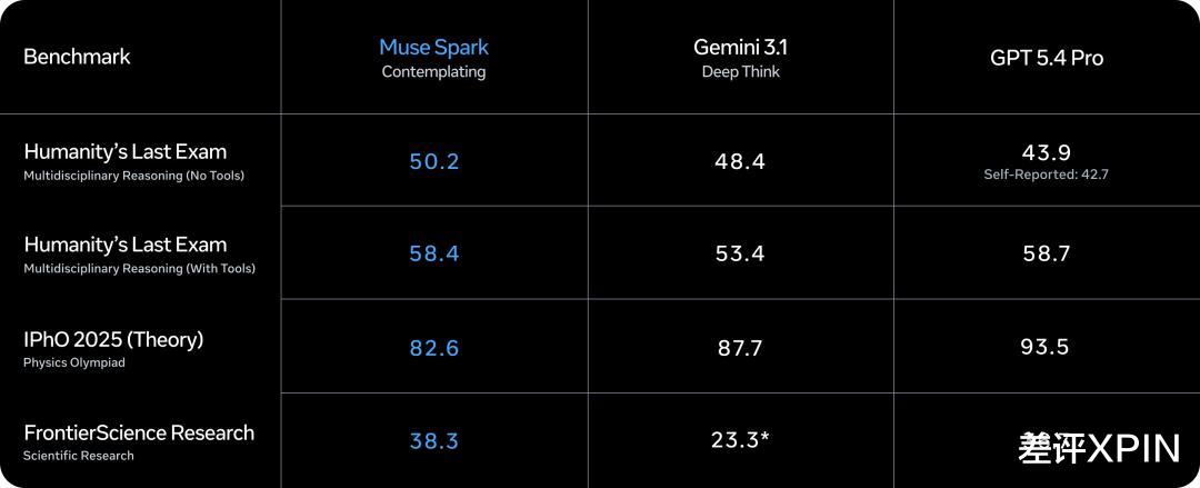 而在即将推出的 “ 沉思模式 ” 下,Muse Spark 在一些高难测试集,如 Humanity's Last Exam 里的思考推理表现,也和 Gemini 3.1 Deep Think,GPT 5.4 Pro 差不多。