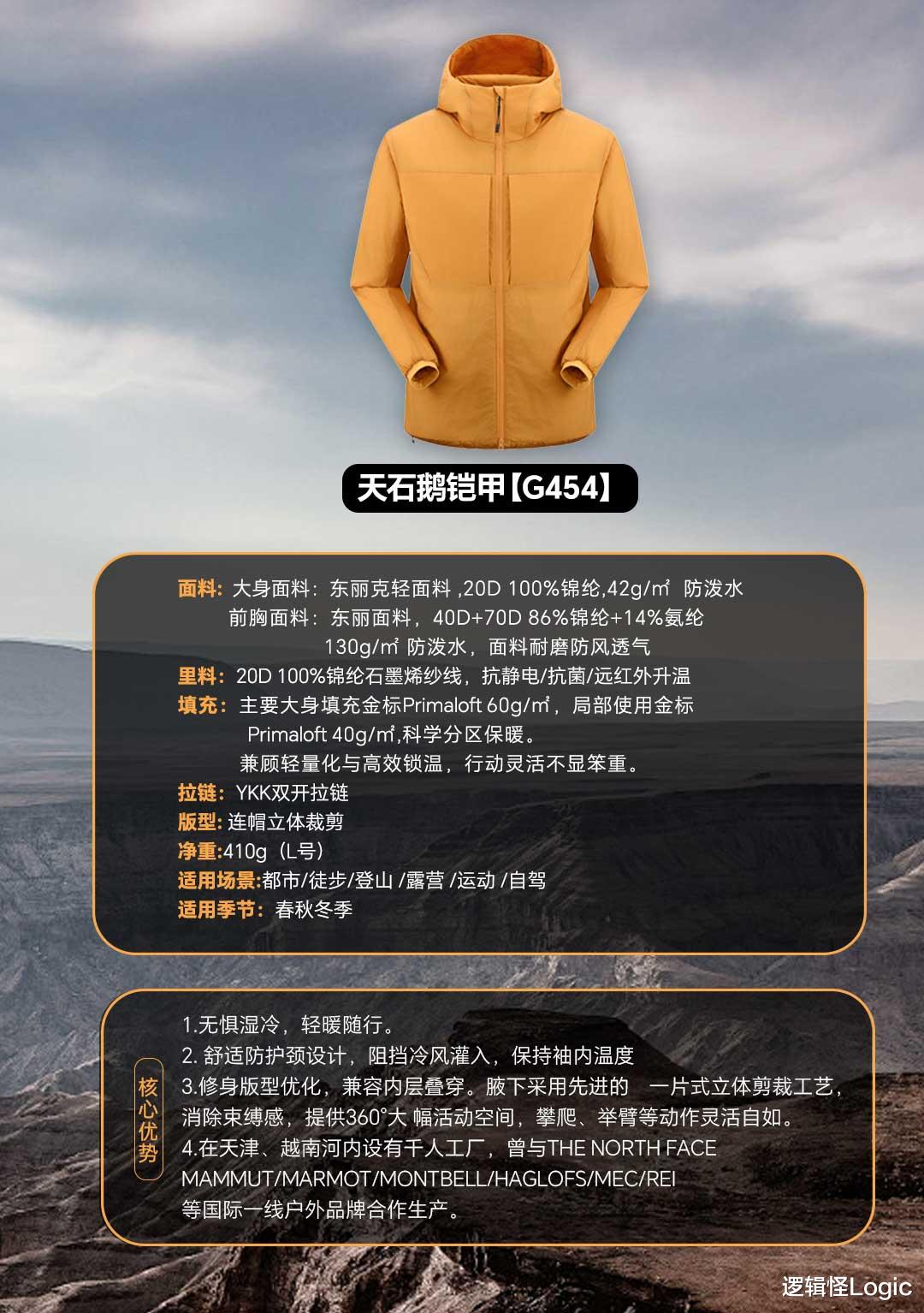 综合比较下来,我最终选了天石鹅铠甲G454。它的剪裁真的舒服,我试过穿着它爬山、举臂拍照、背30升背包,腋下完全没有传统棉服那种“拉扯感”,一片式立体剪裁让动作特别自由,修身但不紧绷,叠穿抓绒内胆也毫无压力。