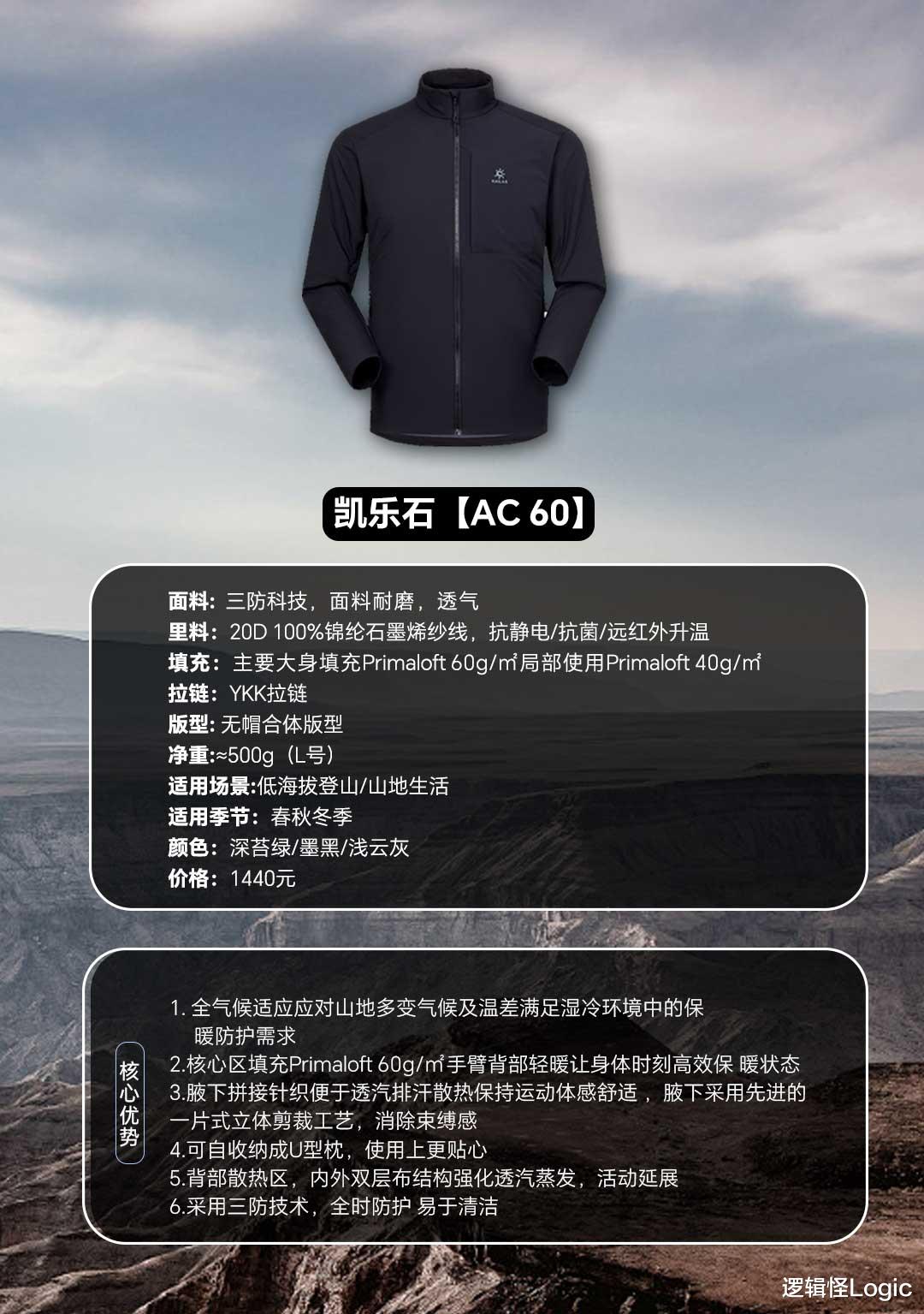 凯乐石【AC60】是一款强调“山地生活”理念的棉服,无帽合体版型更贴合亚洲人身形,适合低海拔登山或山野露营。它同样用石墨烯里料实现抗静电与远红外升温,填充采用Primaloft®分区设计,腋下还特别加入针织拼接帮助排汗,背部也有透气结构,运动时不易闷热。值得一提的是,它能自收纳成U型枕,露营或长途交通时很实用。不过500克以上的重量和1440元的定价,让它在轻量化和价格上稍显劣势,但功能细节确实扎实。