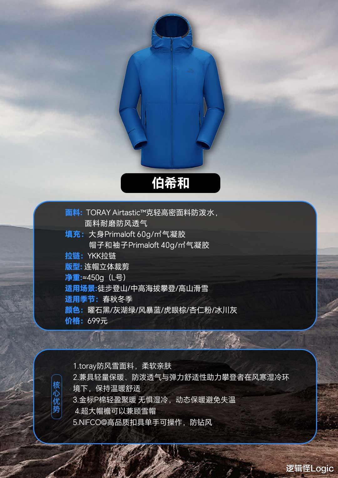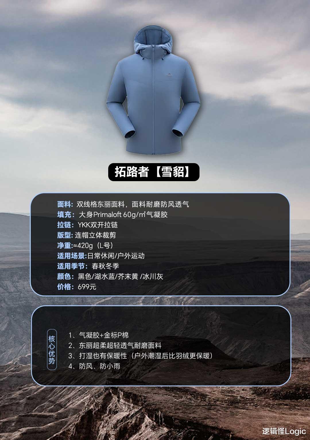 【伯希和】这款明显更偏向中高强度户外场景,比如高海拔徒步或滑雪。它采用TORAY Airtastic™高密防泼水面料,柔软亲肤的同时防风抗湿,填充同样是金标Primaloft®棉+气凝胶组合,大身60克、帽袖40克,分区逻辑清晰。超大帽檐能兼容滑雪头盔,NIFCO扣具支持单手操作,细节考虑周到。整件约450克,颜色选择丰富,连杏仁粉这种低饱和色都有,兼顾功能与都市感,同样定价699元,性价比突出。