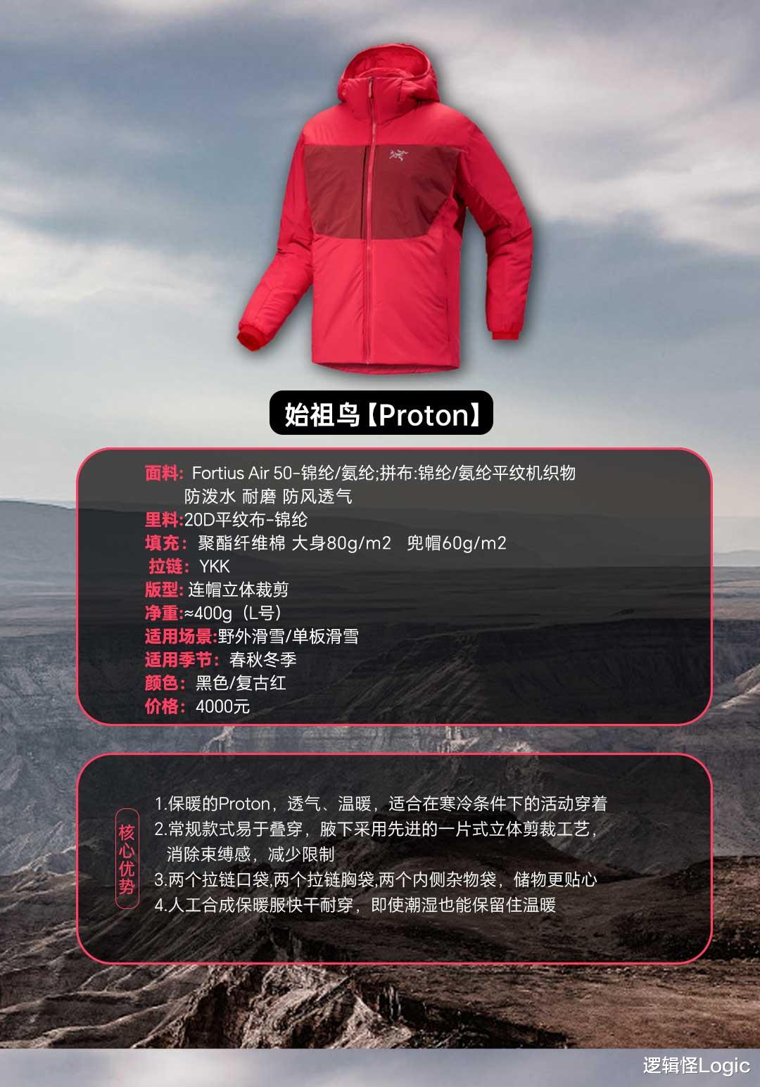 始祖鸟【Proton】作为高端代表,定位明确:为寒冷环境下的动态活动而生,尤其适合滑雪等高强度场景。它用的是带弹力的Fortius Air面料,拼接设计提升活动自由度,填充密度更高(大身80克/㎡),保暖更强。虽然重量仅约400克,但结构扎实,储物系统也更复杂:四个外拉链袋加两个内袋,实用性拉满。不过4000元的售价决定了它更适合专业玩家,日常通勤穿略显“性能过剩”。
