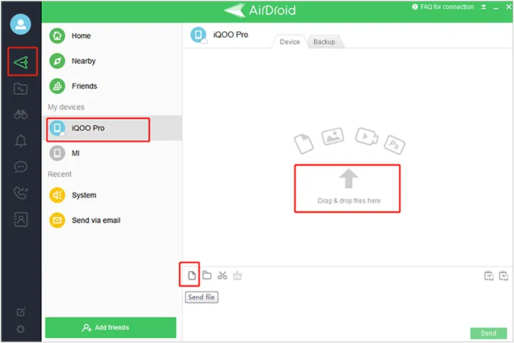在笔记本电脑的 AirDroid 应用程序上,在设备列表中找到你的手机。将要传输的图片和其他文件拖放到手机图标上。