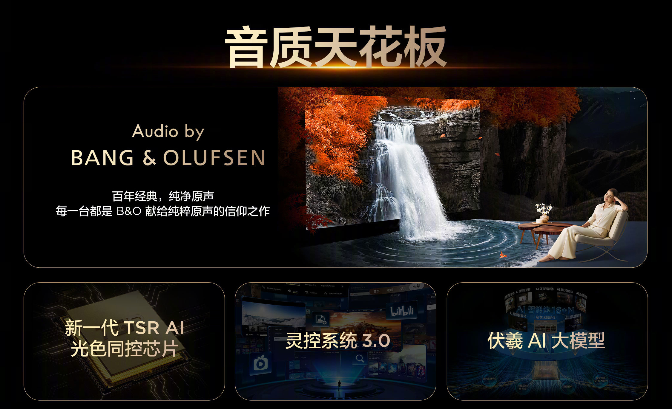 在智能交互层面,X11L同样引领行业。灵控系统3.0带来了“无开机广告、不卡顿”的纯净体验,卡片式自定义桌面赋予用户充分的自主权。深度融合的伏羲AI大模型,作为电视行业首个超级智能体,整合了多种AI能力,覆盖影音、穿搭等18+N种智能场景,新增的AI相册智能体更是在大屏上提供了优于手机的图片管理与创作体验。这一切智能操作的流畅与画质优化。音质方面,由Bang&Olufsen深度定制的音响系统,采用Hi-END级技术,实现了0°无损前出音,动态范围提升3倍,为用户构建了沉浸式临场声场,实现了音画合一的全方位卓越。