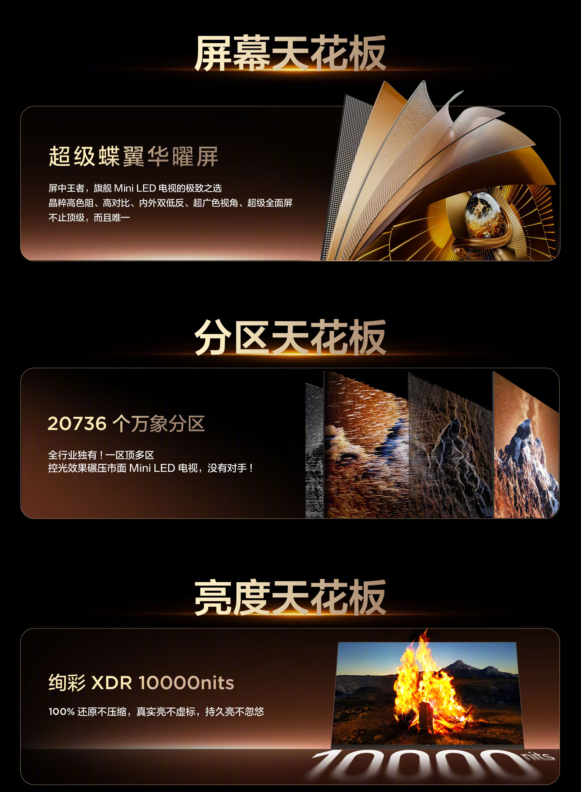 此外,得益于“单灯白光”的设计理念,SQD-Mini LED在同等尺寸与技术下,分区数量可达RGB方案的3倍,控光精度实现质的飞跃。结合超级蝶翼华曜屏与微距OD技术,其在实现约2cm全球最薄机身的同时,仍能保障XDR 10000nits峰值亮度稳定输出与长寿命表现,真正做到了“色彩不妥协、控光更精准、机身更极致”。