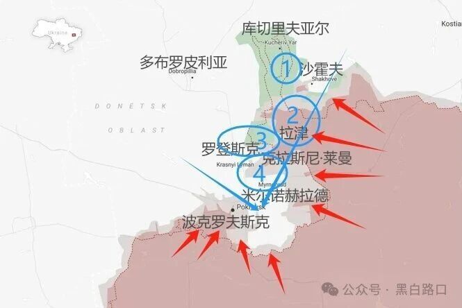 罗登斯克和米尔诺赫拉德之间(蓝圈4)的局势正在恶化,俄军第51集团军正从多个方向攻击米尔诺赫拉德。