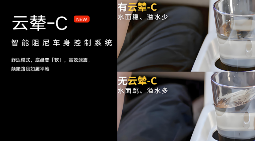 云辇-C智能阻尼车身控制系统实现舒适为主、兼顾运动的黄金平衡,起步刹车稳如泰山,给驾乘体验带来“质”的飞跃,对晕车党超级友好。在颠簸路面,云辇-C可以提供更稳定的乘坐体验;急转、加速或制动时,可以让车辆操控更加精准;紧急避险时,系统还可以有效减少车身倾斜和滑动,大幅提升车辆操控安全性。无论用户想追求舒适还是驾驭乐趣,云辇-C都能满足,让年轻人享受到“科技平权”带来的极致驾乘体验。