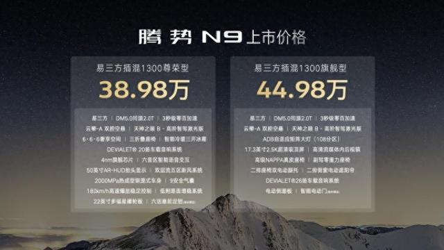 2025年3月21日,科技安全全能旗舰SUV腾势N9震撼上市不再低调,以科技致敬奋斗者时代。推出易三方插混1300尊荣型、易三方插混1300旗舰型,官方指导价38.98万元—44.98万元。科技重构旗舰SUV,腾势N9全系标配易三方、2.0T超级混动、云辇-A(双腔空气悬架)、天神之眼 B,重塑50万级大型旗舰SUV价值标杆,开启科技豪华SUV新纪元。