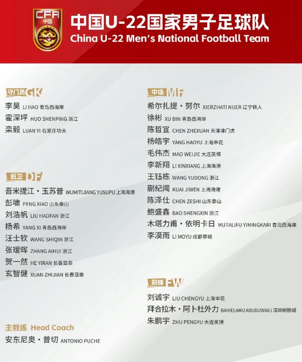 U23亚洲杯小组抽签结果出炉,中国队与澳大利亚、伊拉克和泰国分在一个小组。U23亚洲杯将在2026年1月7日到25日进行,比赛地点是沙特。U22国足最新一期集训名单,泰山队两人入选,分别是彭啸和陈泽仕。