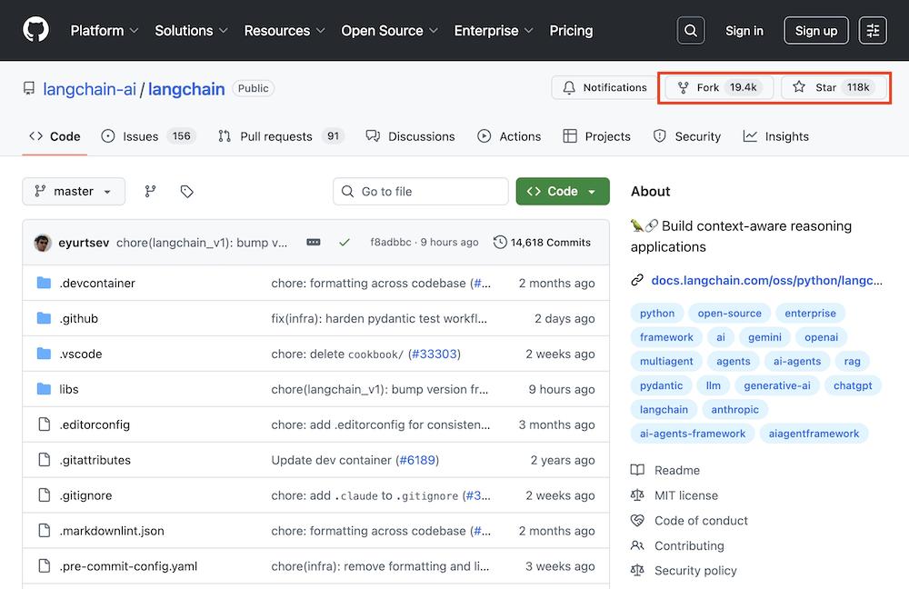 根据GitHub数据,LangChain目前已收获11.8万个Star与近2万个Fork,继续在开源开发者社区保持高热度。