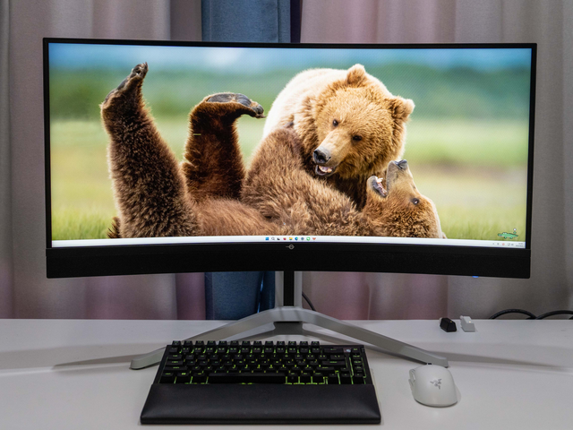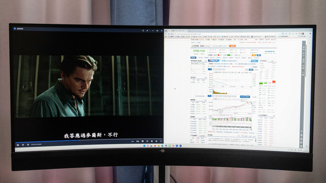 股市操作间隙想放松时,分屏功能又能瞬间切换成 “休闲模式”—— 不用关闭交易软件,只需将屏幕左侧换成视频平台,就能一边留意大盘动态,一边看电影。21:9 的比例刚好适配宽屏影视内容,加上1500R曲面的包裹感,配合 98% DCI-P3 广色域和 HDR1000 效果,观影体验更加沉浸。