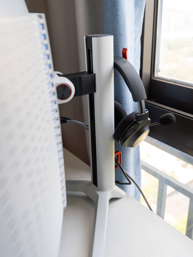 搭载人体工学支架,支持升降、旋转和俯仰调节,也支持VESA壁挂,我单手就能轻松调至舒适角度。支架的背面还有一个耳机挂钩和一个理线槽,实用性拉满。