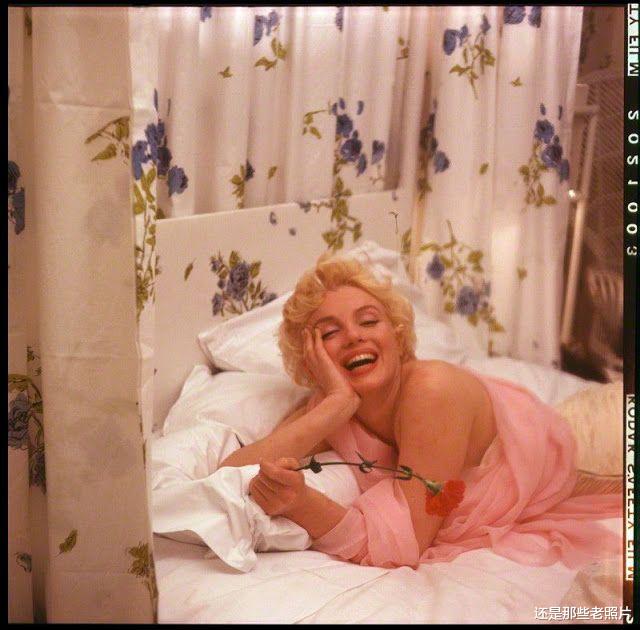 躺在床上的美国好莱坞影星玛丽莲·梦露,露着香肩,露出灿烂的微笑。塞西尔·沃尔特·哈迪·比顿(Cecil Walter Hardy Beaton)拍摄