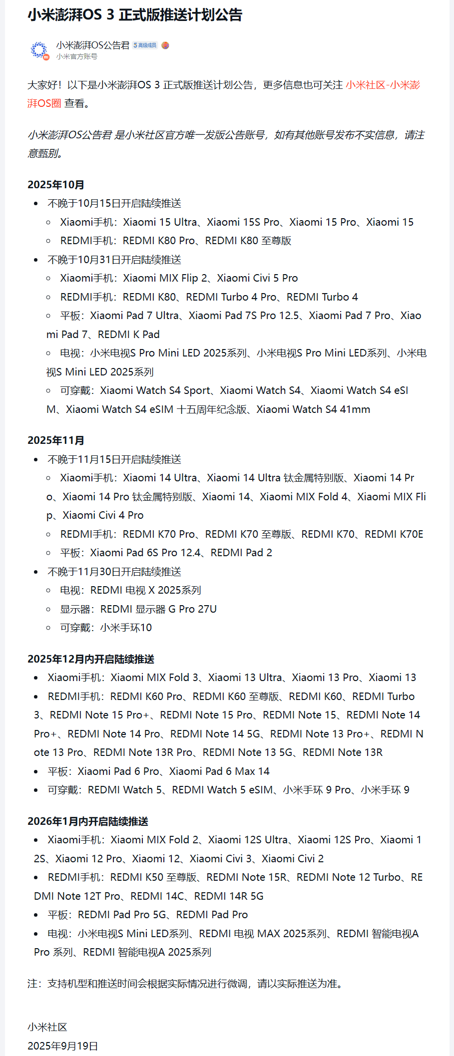 9月19日晚,小米社区官方账号“小米澎湃OS公告君”正式发布了澎湃OS 3 的正式版推送计划。这份公告明确了从 2025年10月到 2026年1月,不同机型与设备的升级时间表,涵盖了小米和Redmi的手机、平板、电视以及可穿戴产品。