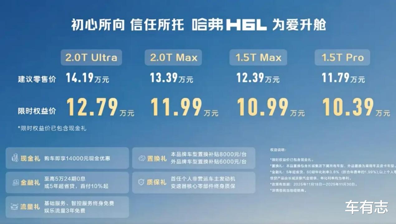 11月18日,哈弗品牌迎来全新车型哈弗H6L,共推出4款车型,指导价格区间为11.79-14.19万元,限时权益价10.39-12.79万元。相比同级别竞争对手,哈弗H6L把性价比、节油性和舒适性三个方面作为卖点,展示出了不错的差异化竞争力。未来,哈弗H6L将与哈弗大狗PLUS一起,进一步加强哈弗品牌在燃油中型SUV市场的竞争力。