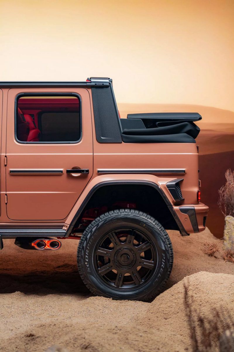 外观方面,800 Cabrio越野车配备专属尾门及Widestar宽体套件,搭配24寸Monoblock ZM铝圈,并使用Hankook Ventus S1 Evo ZX高性能胎。 车身还换上运动化弹簧,降低20至40 mm的车高,使整体造型更为利落。 内装部分则全面升级,提供定制化真皮座椅、碳纤维换档拨片、Airscarf颈部暖风系统,以及大量巴博斯专属饰条与徽饰。